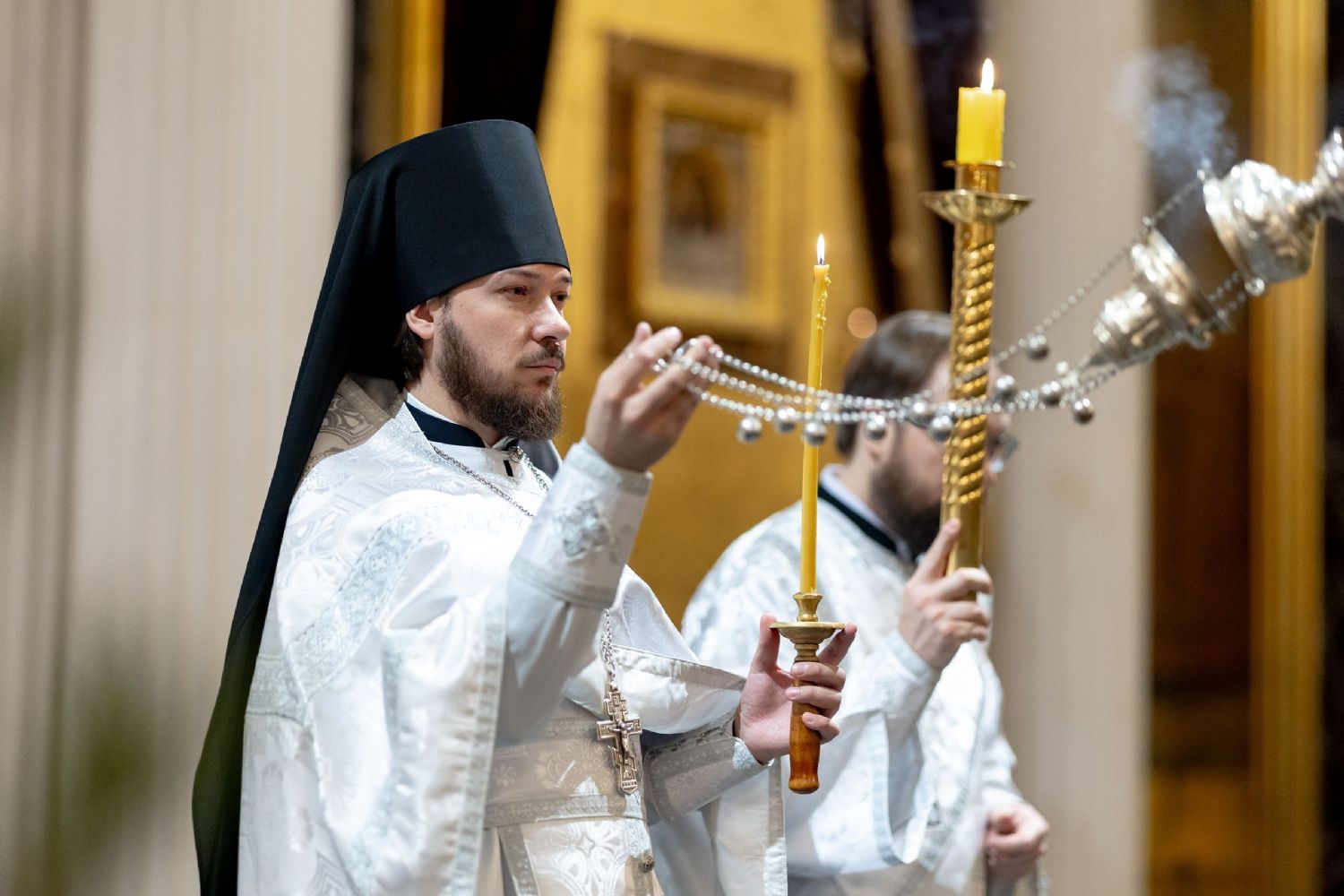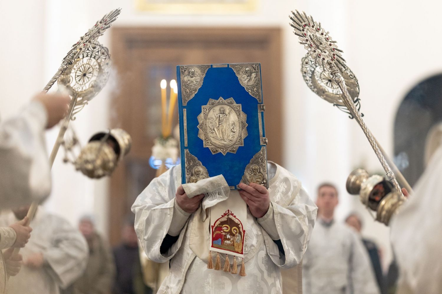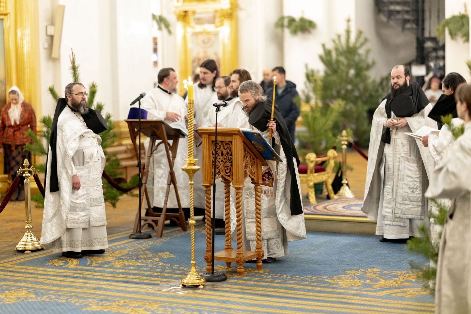 В завершение богослужения на середину храма была вынесена свеча, символизирующая Рождественскую звезду. Духовенство и хор пропели тропарь и кондак праздника Рождества Христова.