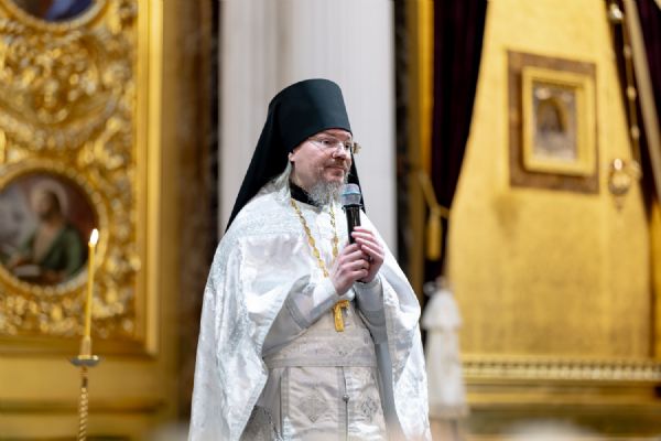 На мирной и сугубой ектениях были вознесены молитвы о Российском воинстве и о мире. По запричастном стихе проповедь произнёс насельник монастыря иеромонах Гермоген (Рубан).