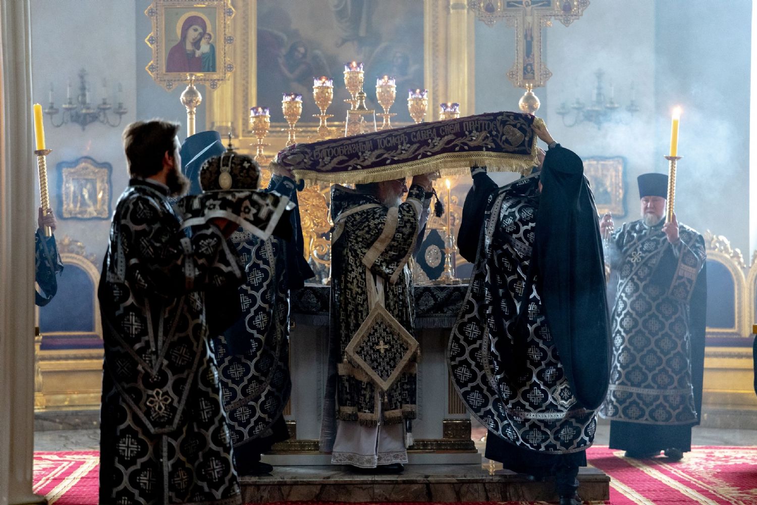 Во время пения тропаря «Благообразный Иосиф…» Святая Плащаница была изнесена духовенством из алтаря на середину храма.